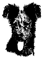 The dark areas on the diagram illustrate where the coat is at its shortest (about 1-3 cm or 1/2 - 1-1/4 inches ), the white areas represent those areas where the coat is at its longest (7 cm, 2-3/4 inches maximum), in the gray areas the coat is somewhere in between. The length of coat is measured when the coat is curled up, so the actual length of the hairs is longer than these measurements. The final length of the coat depends on the structure of the Pumi: the coat of a strong-bodied Pumi should be kept shorter, while a light-bodied Pumi can have longer hair, etc. There shouldn’t be any clear edges in the coat - everything should be rounded.
